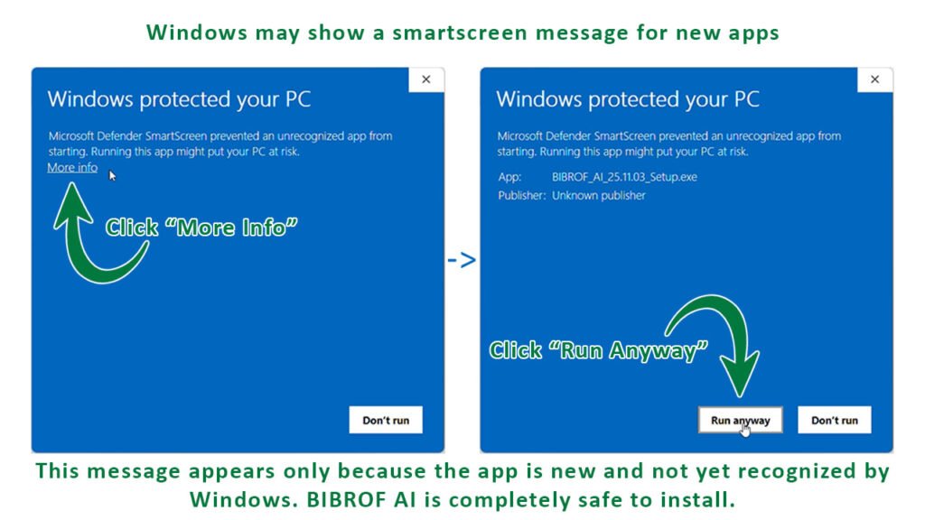 Yes, BIBROF AI is a legitimate Windows desktop app developed by Lislip. Windows SmartScreen may show a brief warning for unsigned executables, but you can safely click “More info” → “Run anyway.” All processing stays local on your machine.
